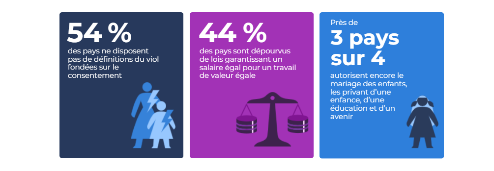 Si des progrès ont été accomplis, aucun pays n’est encore parvenu, aujourd’hui, en 2026, à totalement combler l’écart juridique qui sépare les hommes et les femmes. À l’échelle mondiale, les femmes ne disposent que de 64 % des droits légaux accordés aux hommes. Dans presque tous les domaines de la vie (travail, finances, sécurité, famille, propriété, mobilité, entrepreneuriat et pension), la loi demeure bien souvent défavorable aux femmes.
