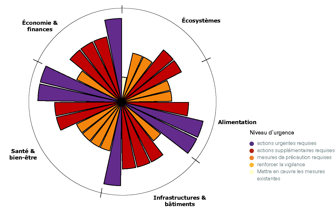 Le rapport classe les risques en cinq clusters : les écosystèmes, l’alimentation, les infrastructures et les bâtiments, la santé humaine et le bien-être de la population et l’économie et la finance. Parmi les 28 risques identifiés dans le rapport, le CERAC en épingle six qui requièrent une action urgente :