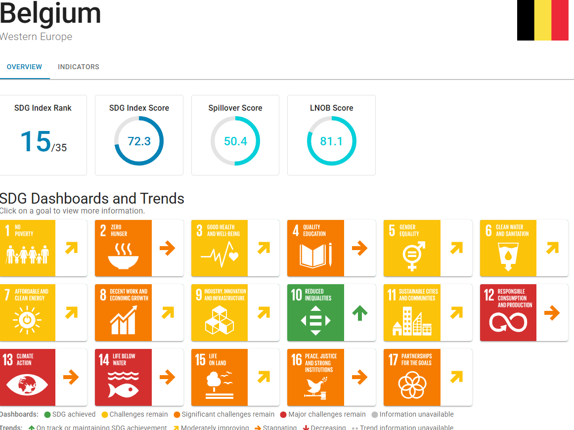 Dans le classement européen des SDG, la Belgique occupe la 15e place sur 35 pays étudiés, avec un indice SDG de 72,3 sur 100. Pour l'indicateur « Ne laisser personne de côté » (qui mesure le degré d'égalité au sein d'un pays), la Belgique obtient un score de 81,1. Le score « spillover », qui indique dans quelle mesure un pays a une influence négative sur le développement durable d'autres pays, s'élève à 50,4, ce qui montre que l'activité économique belge a une empreinte internationale considérable.