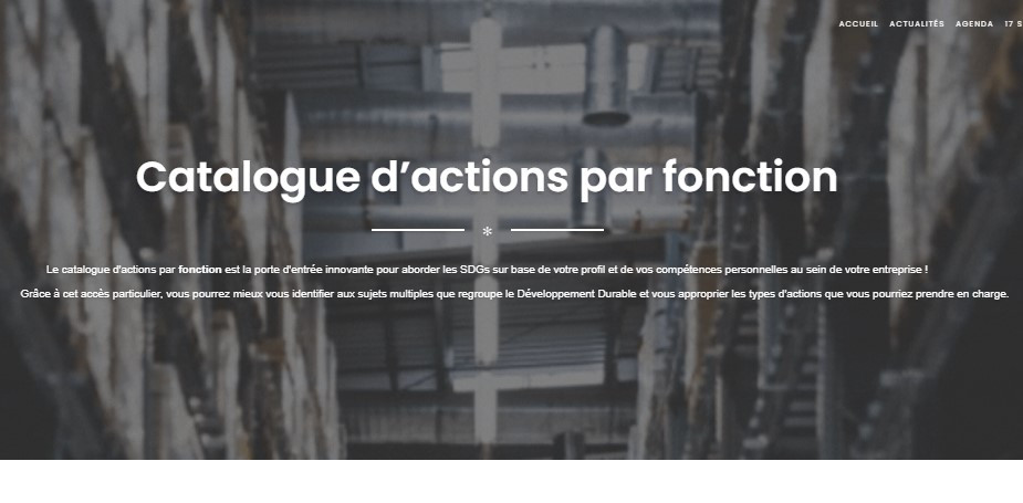 Source https://sdgs-entreprise.be/catalogue-dactions/catalogue-dactions-par-fonction/ Organisation UWE & SPW Description Ce site internet de sensibilisation a pour vocation d’être une plateforme de référence pour les entreprises wallonnes de toute taille qui souhaitent initier des réflexions, mettre en œuvre les SDGs et aller plus loin. Tool language Français Utilisateur Entreprise Age 18+ Objectif Mettre en oeuvre Niveau Débutant Coût Gratuit SDG listé Explicitement Concerned SDG's