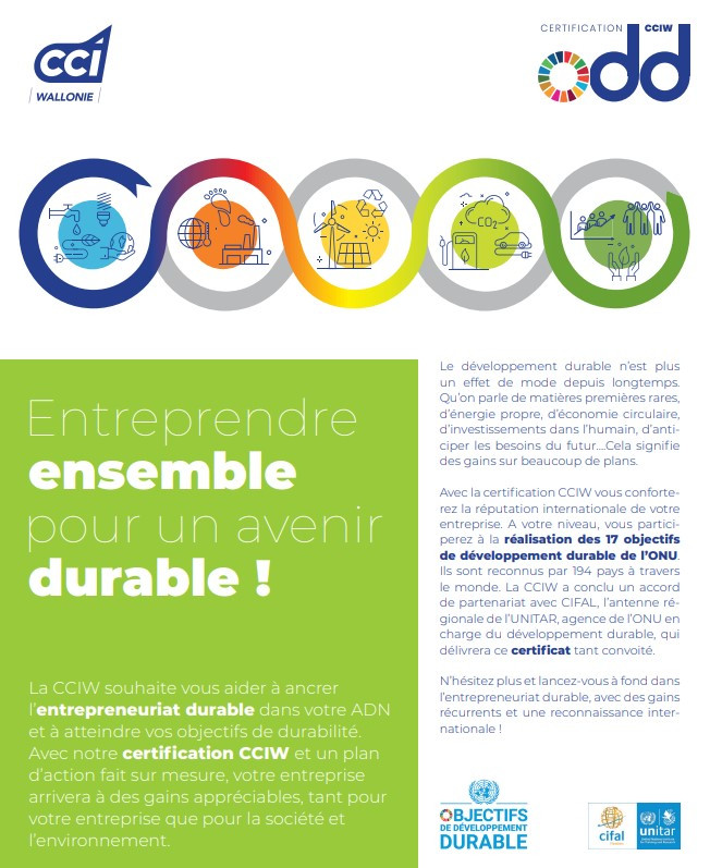 Source https://www.ccibw.be/produit/certification-en-developpement-durable-de-cci-wallonie/ Organisation CCI Wallonie & CIFAL Flanders Description Le programme commun des CCI (Chambre wallonne de Commerce et d'Industrie) s’adresse à toute entreprise active en Wallonie. Mené en trois ans, il débouche sur un certificat validé qui témoigne que l’entreprise a officiellement couvert 17 Objectifs de Développement Durable épinglés par les Etats membres des Nations unies, groupés en 5 catégories (les 5 « P » : « planet », « people », « prosperity », « peace », « partnership »). Tool language Français Utilisateur Entreprise Age 18+ Objectif Mettre en oeuvre Niveau Débutant Coût Payant SDG listé Explicitement Concerned SDG's
