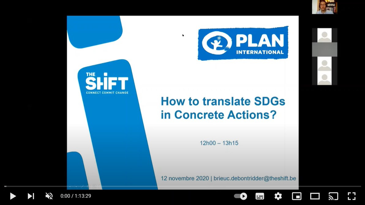 Source https://www.youtube.com/watch?v=r8iZh-mY0m0 Organisation The Shift and Plan International Belgium Description This webinar was held in the context of the SDG Challenge, organised by Plan International Belgium in collaboration with The Shift, BDO Belgium and StoryMe. Various public and private sector organisations shared their good practices on how to contribute to the Sustainable Development Goals. Tool language Néerlandais Français Anglais Utilisateur Enseignement Age 18+ Objectif Mettre en oeuvre Niveau Débutant Coût Gratuit SDG listé Explicitement Concerned SDG's Principles: People Oui Principles: Planet Oui Principles: Peace Oui Principles: Prosperity Oui Principles: Partnership Oui Leave no one behind Yes Differentiated focus on more vulnerable groups? Implicit Intergenerational solidarity? Implicit International solidarity? Implicit