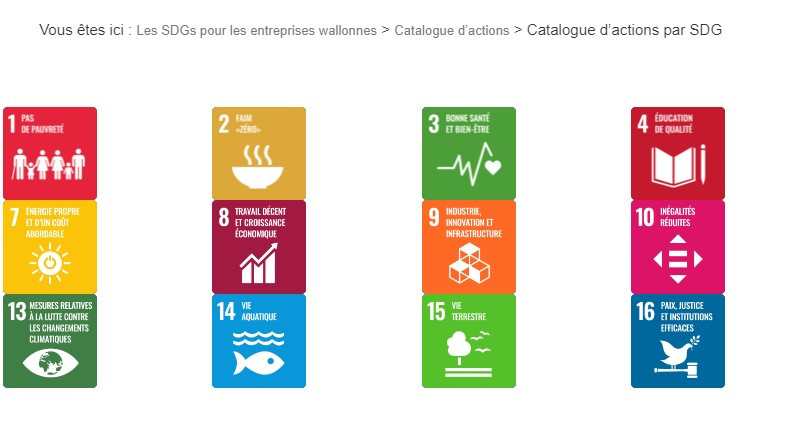 Source https://sdgs-entreprise.be/catalogue-dactions/catalogue-dactions-par-sdg-odd/?color=00a98f Organisation Les SDGs - UWE & SPW Description Ce site internet de sensibilisation a pour vocation d’être une plateforme de référence pour les entreprises wallonnes de toute taille qui souhaitent initier des réflexions, mettre en œuvre les SDGs & aller plus loin. Tool language Français Utilisateur Entreprise Age 18+ Objectif Découvrir Niveau Connaiseur Coût Gratuit SDG listé Explicitement Concerned SDG's
