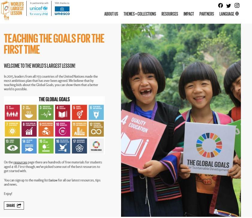 Source https://worldslargestlesson.globalgoals.org/fr/ Organisation World's Largest Lesson, Unesco & Unicef Description Nous encourageons l'utilisation des Objectifs de Développement Durable dans l'apprentissage afin que les enfants puissent contribuer à un meilleur avenir pour tous. De la citoyenneté et de la justice au changement climatique et à l'environnement, inspirez les enfants à faire une différence ! Tool language Français Anglais Utilisateur Citoyen·ne Age 18+ Objectif Découvrir Niveau Débutant Coût Gratuit SDG listé Explicitement Concerned SDG's